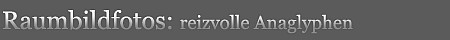 Ein tolles Gefühl. Schon das Suchen des Motives, aber auch die nachträgliche Aufbereitung und elektronische Justage der beiden Teilbilder ist sehr spannend. In der Raumbildfotografie setzt sich mehr und mehr das Herstellen von Rot und Cyan eingefärbten Teilbildern, den so genannten Anaglyphen durch, für deren Betrachtung Mensch allerdings eine Rot-Cyan-Brille braucht. Ach so: die Kamera(s): eine "echte", aber einfache Stereokamera begleitet mich treu seit 8 Jahren: die LOREO-Stereo-Kamera aus Hongkong. Sie ist sehr simpel, aber wenn man weiß, wie man fotografiert, leistet sie gute Dienste. In Versteigerungen online ist sie manchmal für wenige Euro zu haben. Eine Galerie einiger Anaglyphen ist ab Mitte 2008 unter www.loreo-in-dresden.de zu sehen. Nach oben