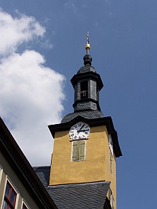 Anfangs wollte ich nur Erinnerungen "knipsen", wie fast alle eben. Das genügte auf Dauer nicht. Mit zunehmender Erfahrung wuchs mein Anspruch. Die Liebe zur Natur, gerade auch zur einheimischen, hat mich mehr und mehr auf den Auslöser drücken lassen. Dabei lege ich wenig Wert auf rasche, den Augenblick einfangende Aufnahmen. Hatte ich das Motiv nach etlicher Zeit so vor der Linse, wie ich das mochte, dann wurde es vielleicht ein gelungenes Bild. Neben Naturaufnahmen fotografiere ich auch gerne Architektur einschließlich Architekturdetails bzw. bestimmte historische oder moderne Kunstwerke. Sehen Sie hier z. B. eine Aufnahme von mir, die ich mit der neu erworbenen Kodak ZD 710-Kamera einfangen konnte: Der Turm des historischen Rathauses im thüringischen Rudolstadt (Juli 2009).